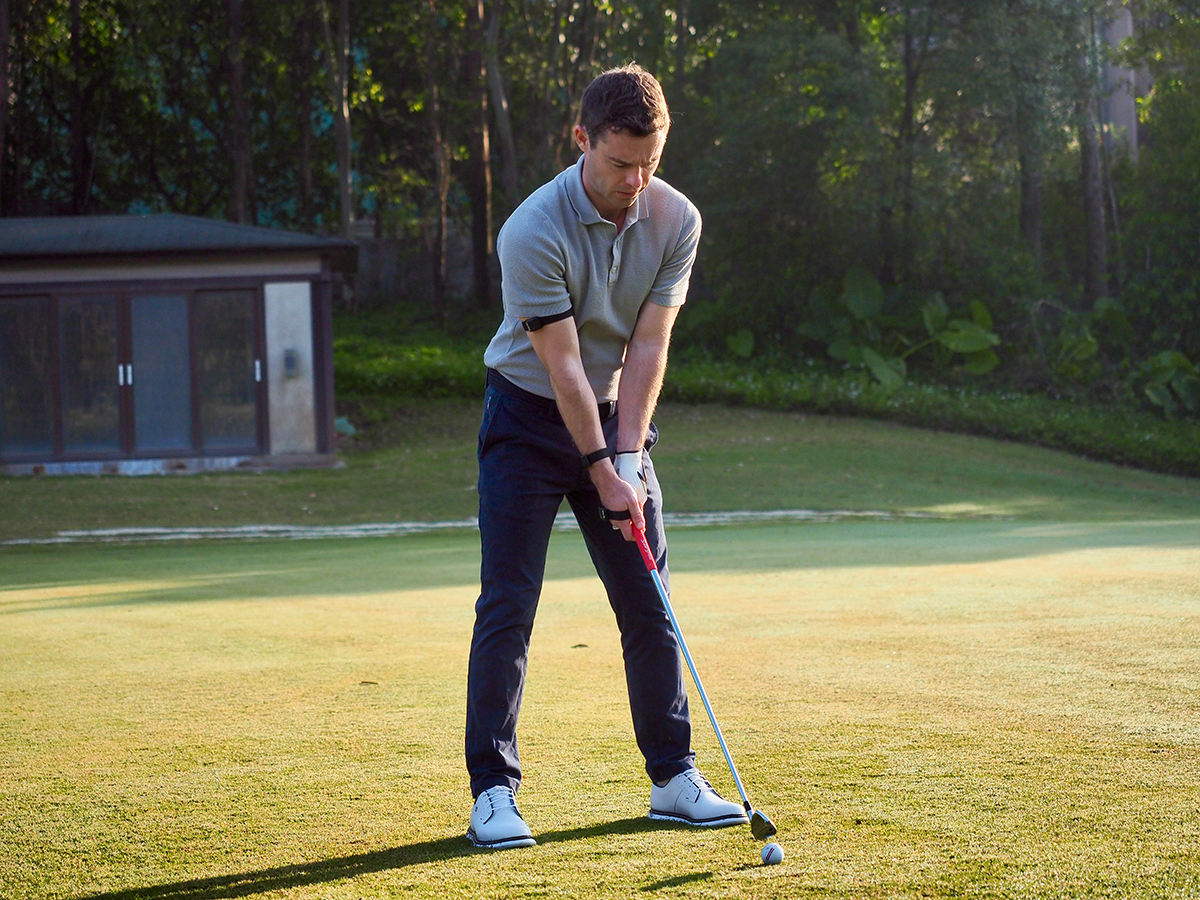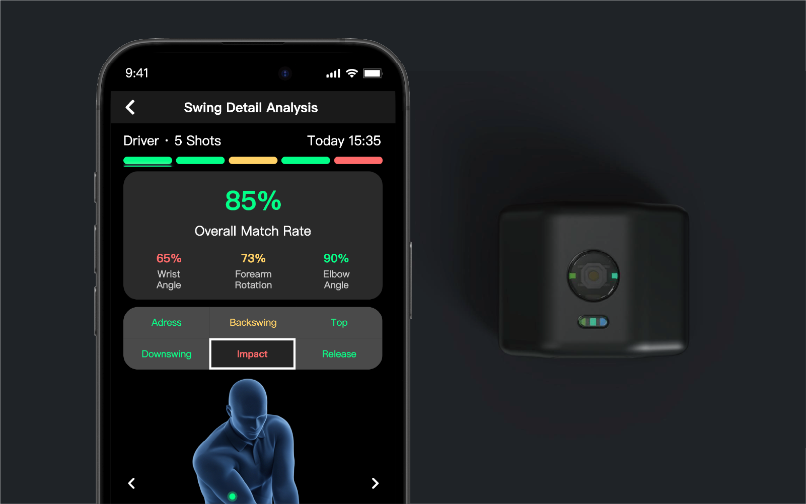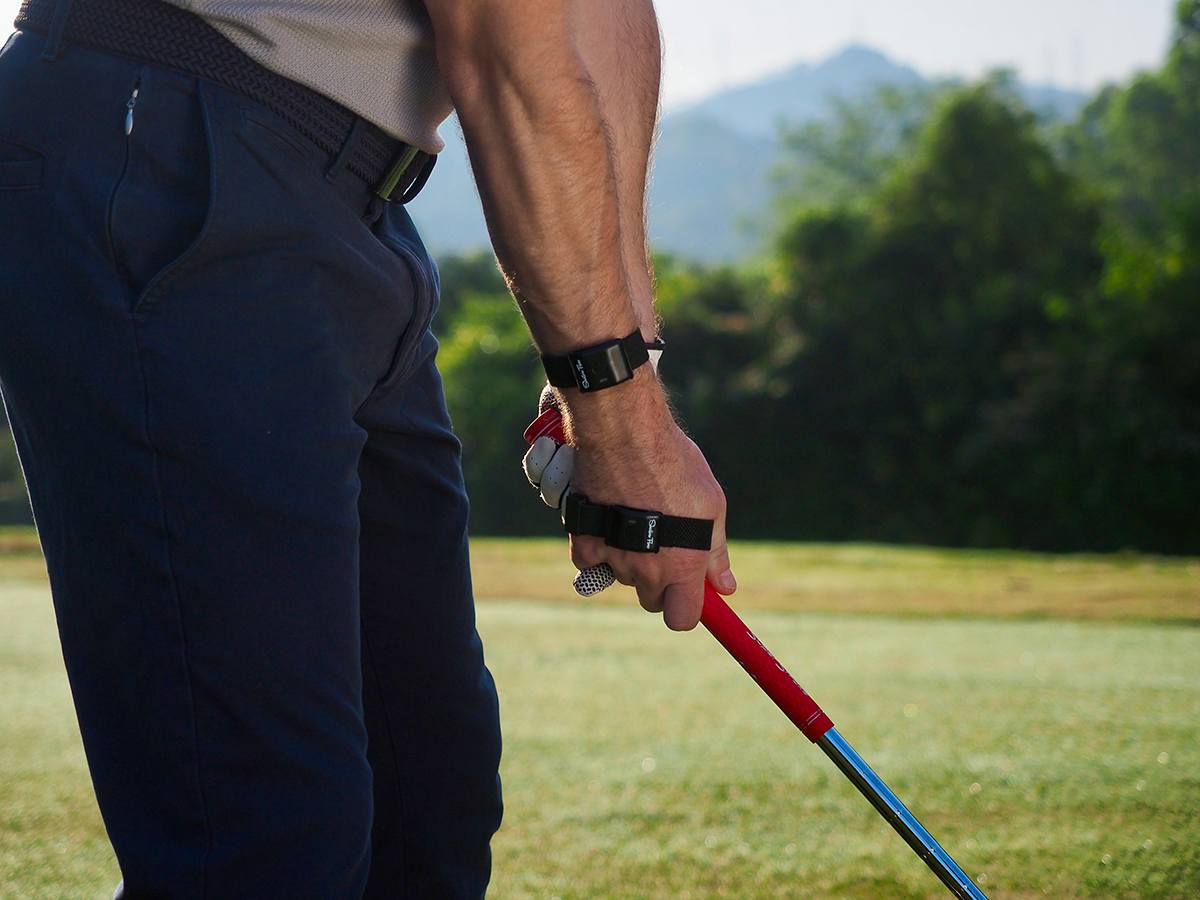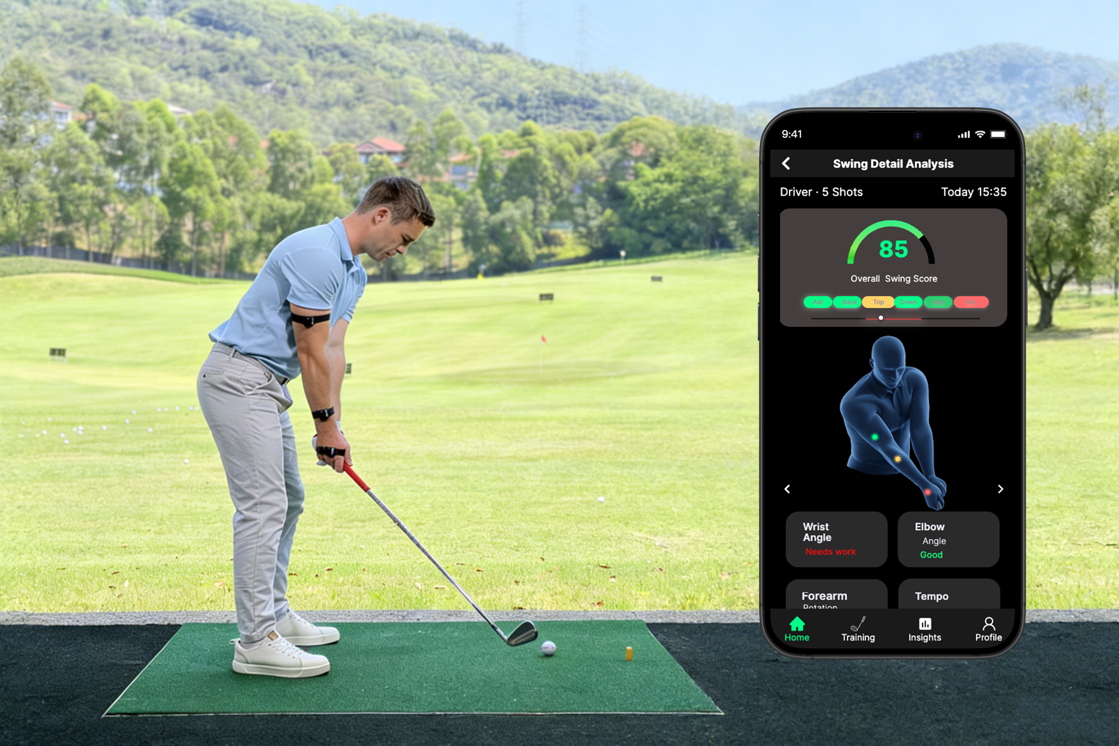 Lightweight, body-worn sensors track right-arm and shoulder movement throughout the golf swing, capturing how the upper body moves in real time.